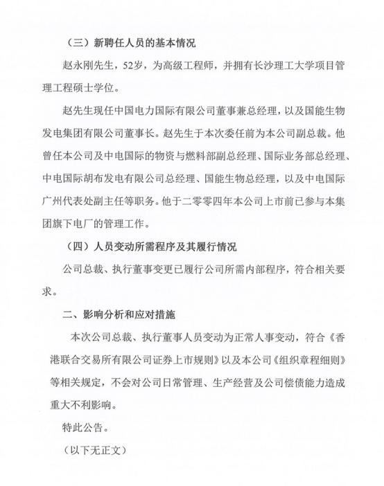 赵永刚先生获委任为本公司执行董事兼总裁以接替高先生之职务。与此同时,赵先生已获委任接替高先生辞任后本公司风险管理委员会、战略与可持续发展委员会及执行委员会的成员之职务。