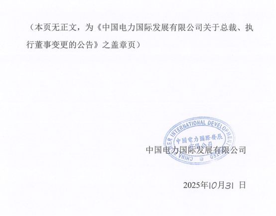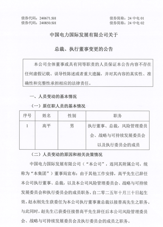 10月31日,中国电力发布公告称,公司董事局宣布,由于其他工作安排,高平先生已辞任本公司执行董事、总裁,以及本公司风险管理委员会、战略与可持续发展委员会和执行委员会的成员职务,自2025年10月30日起生效。