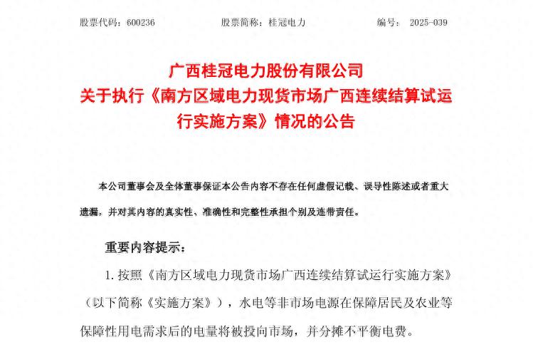 桂冠电力日前公告称,按照《南方区域电力现货市场广西连续结算试运行实施方案》(下称《方案》),水电等非市场电源在保障居民及农业等保障性用电需求后的电量将被投向市场,并分摊不平衡电费。