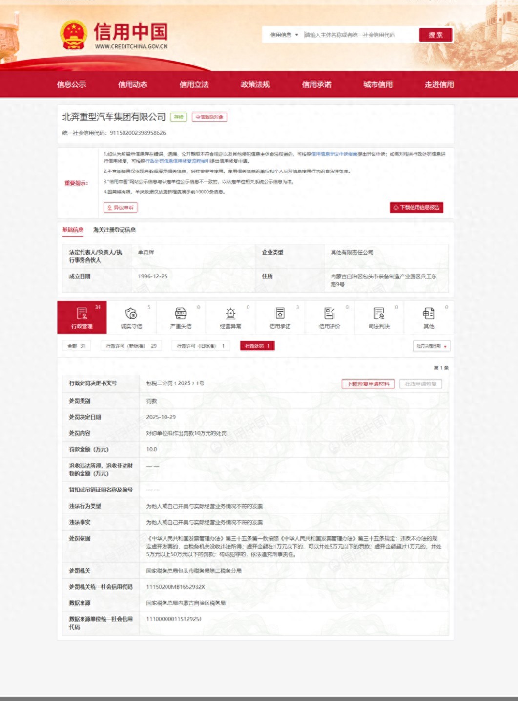 近日,北奔重型汽车集团有限公司因存在虚开发票的税收违法行为,被国家税务部门依法罚款十万元,处罚决定于2025年10月29日作出。