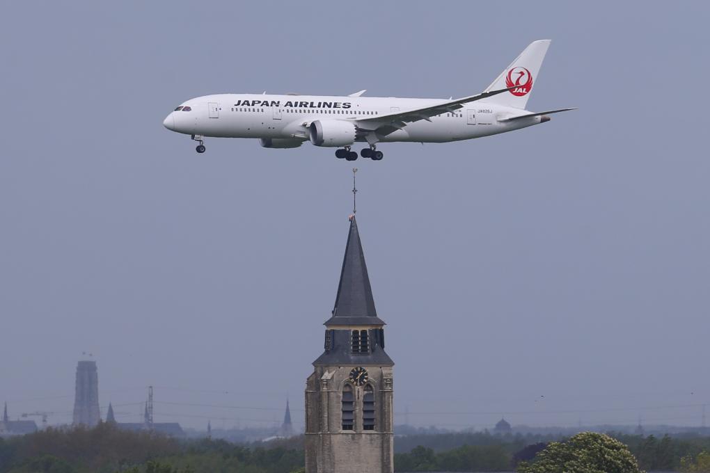2021年5月21日,日本航空公司的一架航班准备在比利时布鲁塞尔机场降落。新华社记者郑焕松摄