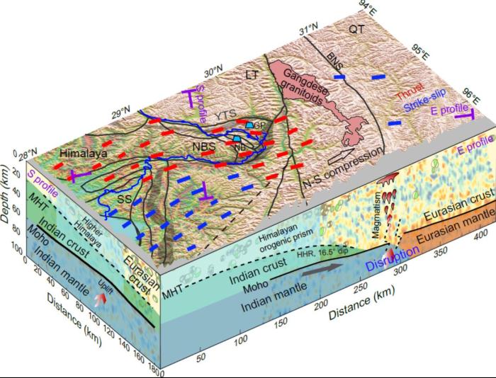 此次研究还表明,印度板块的北向运动与大型逆冲断裂系统的发育密切相关,该系统不仅包括主喜马拉雅逆冲断裂所呈现的平缓-斜坡构造,也涵盖位于其上方的高倾角断层,这一发现也为理解大地震破裂行为提供了重要线索。