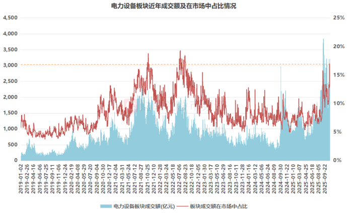 注:电力设备板块近年成交额及在市场中占比情况(截至11月5日收盘)