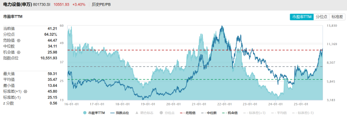 此外,从估值层面来看,电力设备板块指数(申万一级)目前市盈率达41.21倍,处于近十年64.32%分位点;市净率达3.41倍,处于近十年64.22%分位点。若以整个市场统计,电力设备板块指数目前市盈率分位点在31个申万一级板块中位列第6位,仅次于商贸零售、房地产、计算机、电子、汽车板块,并较去年年末时(第13位)共提升7个位次。
