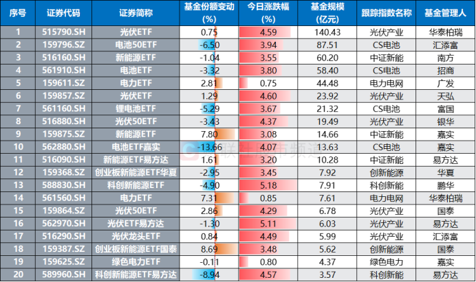 受电力设备股活跃提振,与其相关的ETF基金今日也成为资金扫货重点。截至今日收盘,涨幅居前的20只ETF均所属电力设备系。其中,光伏ETF龙头(560980)以5.59%的涨幅位居涨幅榜首位,涨幅位居第二的电网设备ETF(159326)盘中则一度触及涨停。此外,科创新能源(588830)、光伏ETF易方达(562970)等电力设备相关ETF今日也涨幅居前。