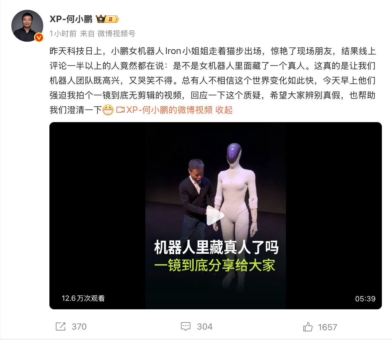 针对最新发布的人形机器人IRON被外界质疑里面藏有真人,小鹏汽车董事长何小鹏作出回应。