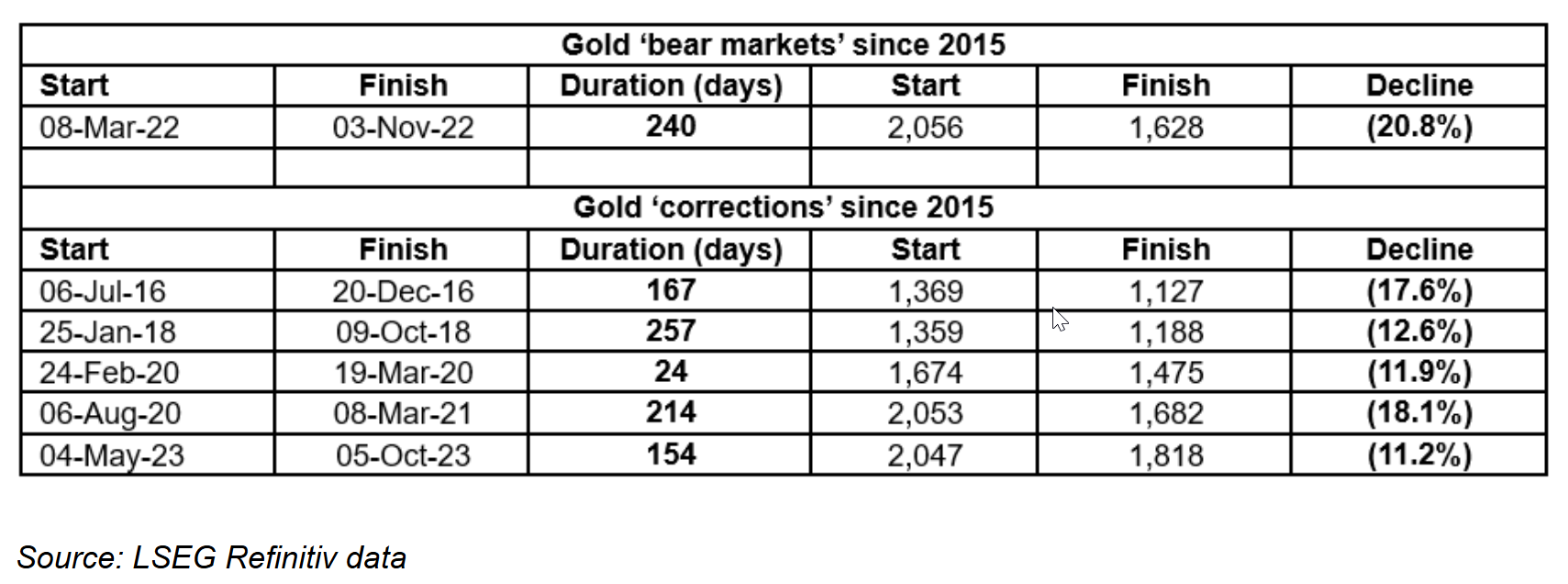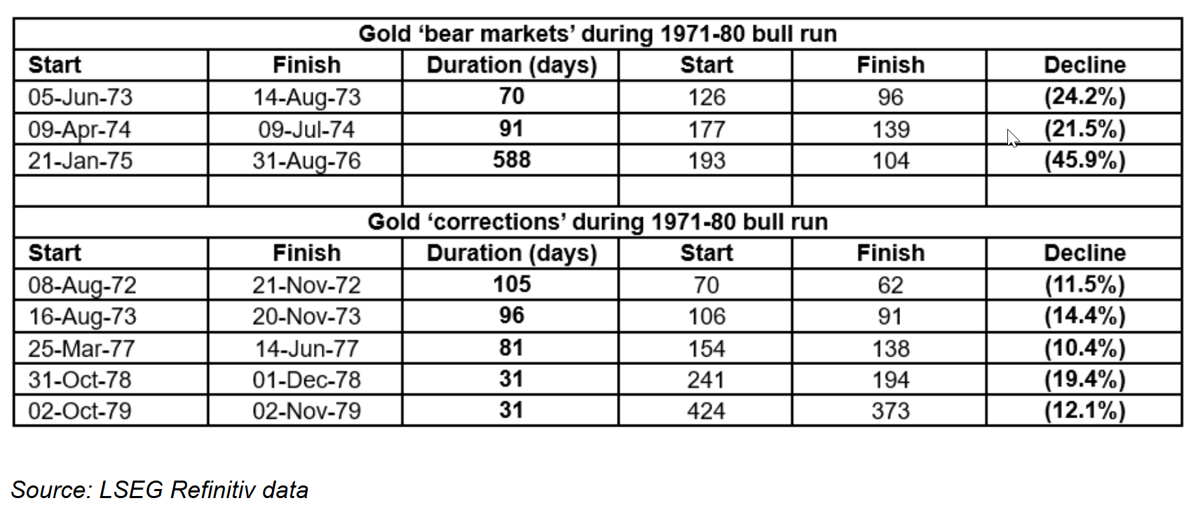 他指出,即使是上世纪70年代的黄金牛市,也出现了不少于三次的“迷你熊市”,其中金价分别在1973年和1974年下跌了20%以上,还有一次从1975年1月到1976年夏季持续了18个多月。