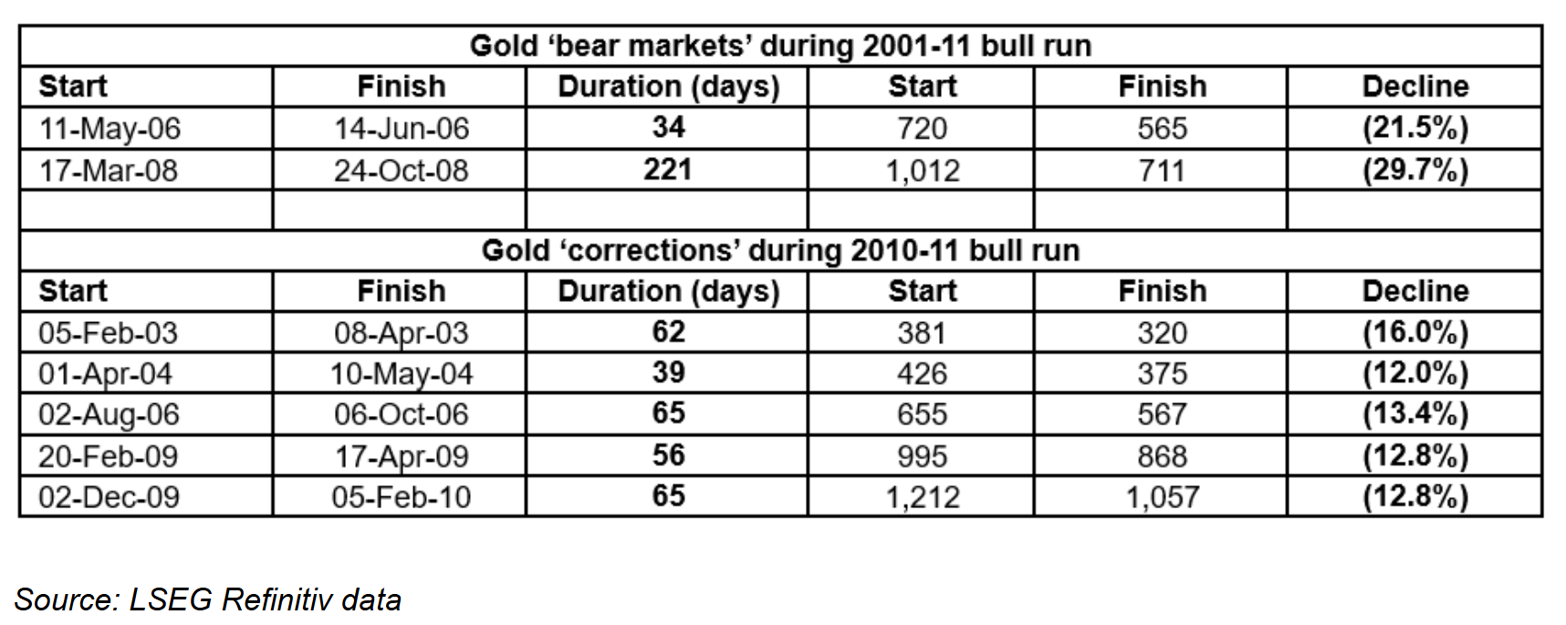 Mould说,虽然最后两次下跌只持续了一个月,但“它们仍然挑战了黄金投资者的决心,尽管金价在牛市的最后冲刺阶段几乎是垂直上涨的。”