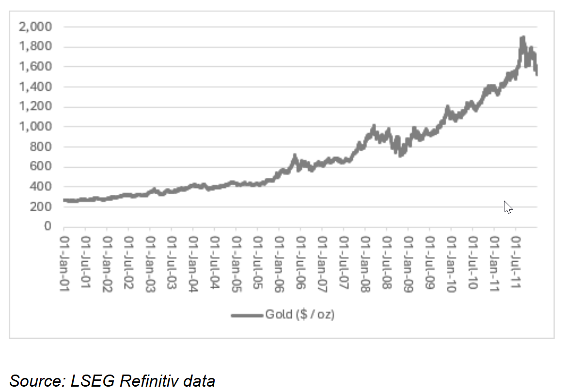 Mould紧接着指出,在2001年触及每盎司略高于250美元的低点后,黄金吸引了“新一代投资者”,他们在2001-03年科技、媒体和电信(TMT)泡沫破裂以及2007-09年金融危机爆发后的超宽松货币政策中寻求庇护。