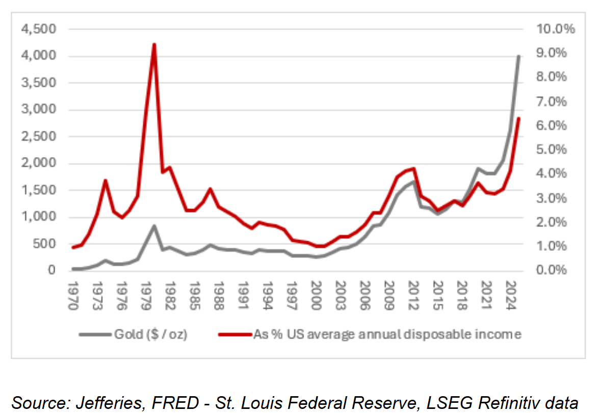 他接着解释称,“在美国总统尼克松于1971年8月让美国脱离金本位制并摧毁布雷顿森林货币体系之前,一盎司黄金仅代表美国家庭年平均可支配收入的1%。而这个数字在上世纪70年代黄金大牛市结束时的1980年末达到了9%以上的峰值。”