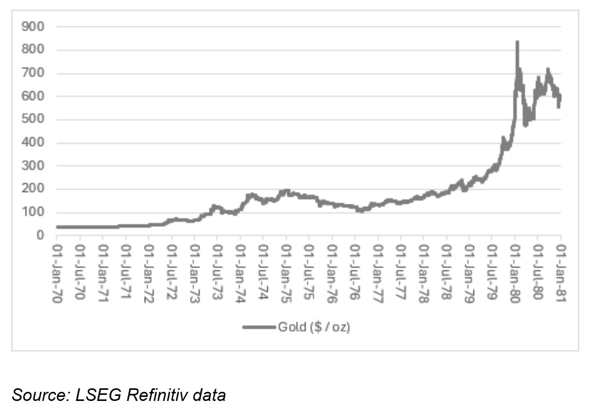 Mould研究的第一次牛市开始于尼克松总统退出金本位、废除布雷顿森林货币体系之时。他指出:“随着尼克松开始推高美国联邦赤字,加上通胀在两次油价冲击的推动下飙升,金价从1971年8月的每盎司35美元一路飙升,并在1980年1月达到835美元的峰值。”