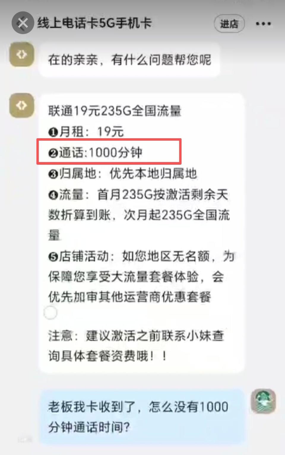 随后,该客服又主动推销称:联通19元235G全国流量包含,月租19元、通话1000分钟、优先本地为归属地、流量为首月235G按激活剩余天数折算到账,次月起235G全国流量。但当袁先生询问起为何已收到的卡“不符实”时,该客服称“您在直播间下单的套餐审核失败了,为不耽误用卡,所以根据地区情况匹配了一个高性价比套餐”。对于袁先生的后续问题,客服未做正面回应。