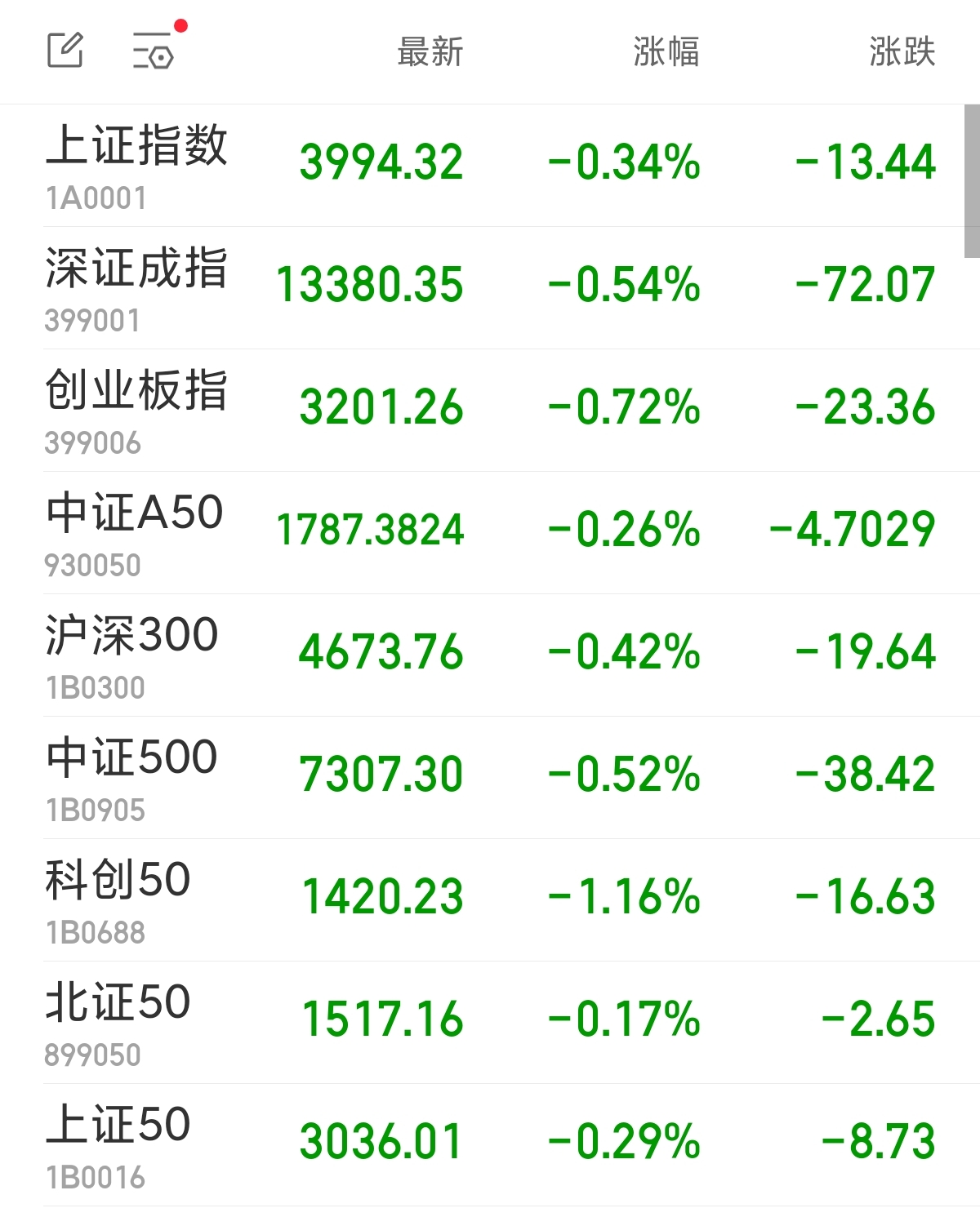 周五,A股三大指数集体低开。上证指数跌0.34%,报3994.32点;深证成指跌0.54%,报13380.35点;创业板指跌0.72%,报3201.26点。