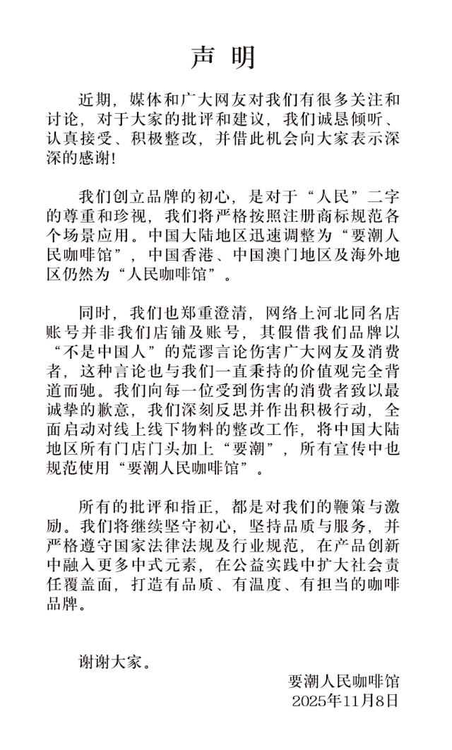 11月8日,要潮人民咖啡馆在社交平台发布声明:近期,媒体和广大网友对我们有很多关注和讨论,对于大家的批评和建议,我们诚恳倾听、认真接受、积极整改,并借此机会向大家表示深深的感谢!我们创立品牌的初心,是对于“人民”二字的尊重和珍视,我们将严格按照注册商标规范各个场景应用。中国大陆地区迅速调整为“要潮人民咖啡馆”,中国香港、中国澳门地区及海外地区仍然为“人民咖啡馆”。