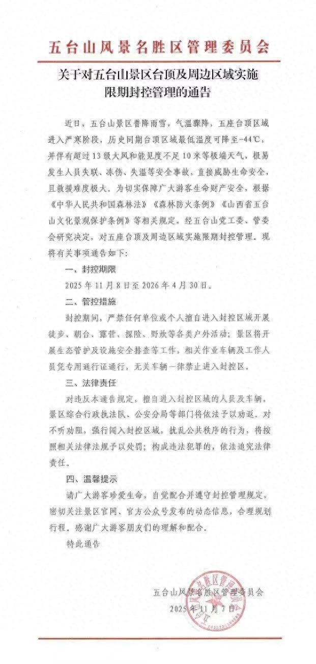 据公告信息,近日,五台山景区普降雨雪,气温骤降,五座台顶区域进入严寒阶段,历史同期台顶区域最低温度可降至零下44摄氏度,并伴有超过13级和能见度不足10米等极端天气,极易发生人员失联、冻伤、失温等安全事故,直接威胁生命安全,且救援难度极大。为切实保障广大游客生命财产安全,根据《中国人民共和国森林法》《森林防火条例》《山西省五台山文化景观保护条例》等相关规定,经五台山党工委、管委会研究决定,对五座台顶及周边区域实施限期封控管理。封控期限为2025年11月8日至2026年4月30日。