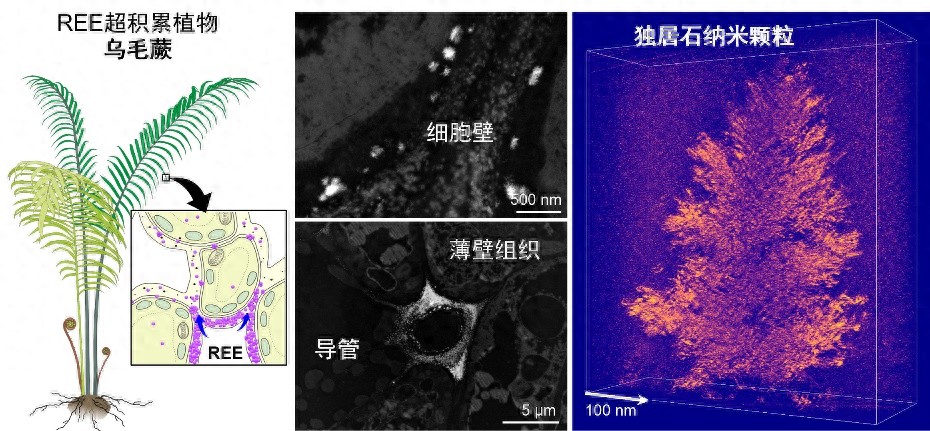 稀土元素在乌毛蕨中生物矿化为独居石纳米多晶聚集体。(研究团队供图)