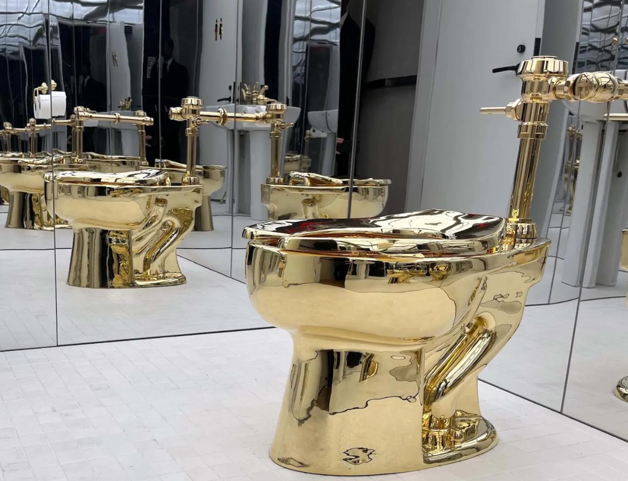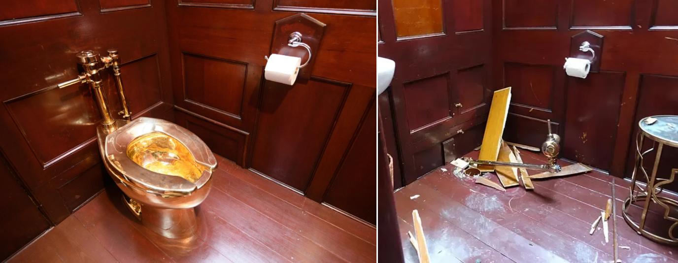 2019年9月14日,这只马桶在英国丘吉尔故居展出时被窃贼手持大锤敲走。今年初英国法院判决两名窃贼有罪,但马桶至今仍下落不明。调查人员认为其很可能已被拆解并熔毁。
