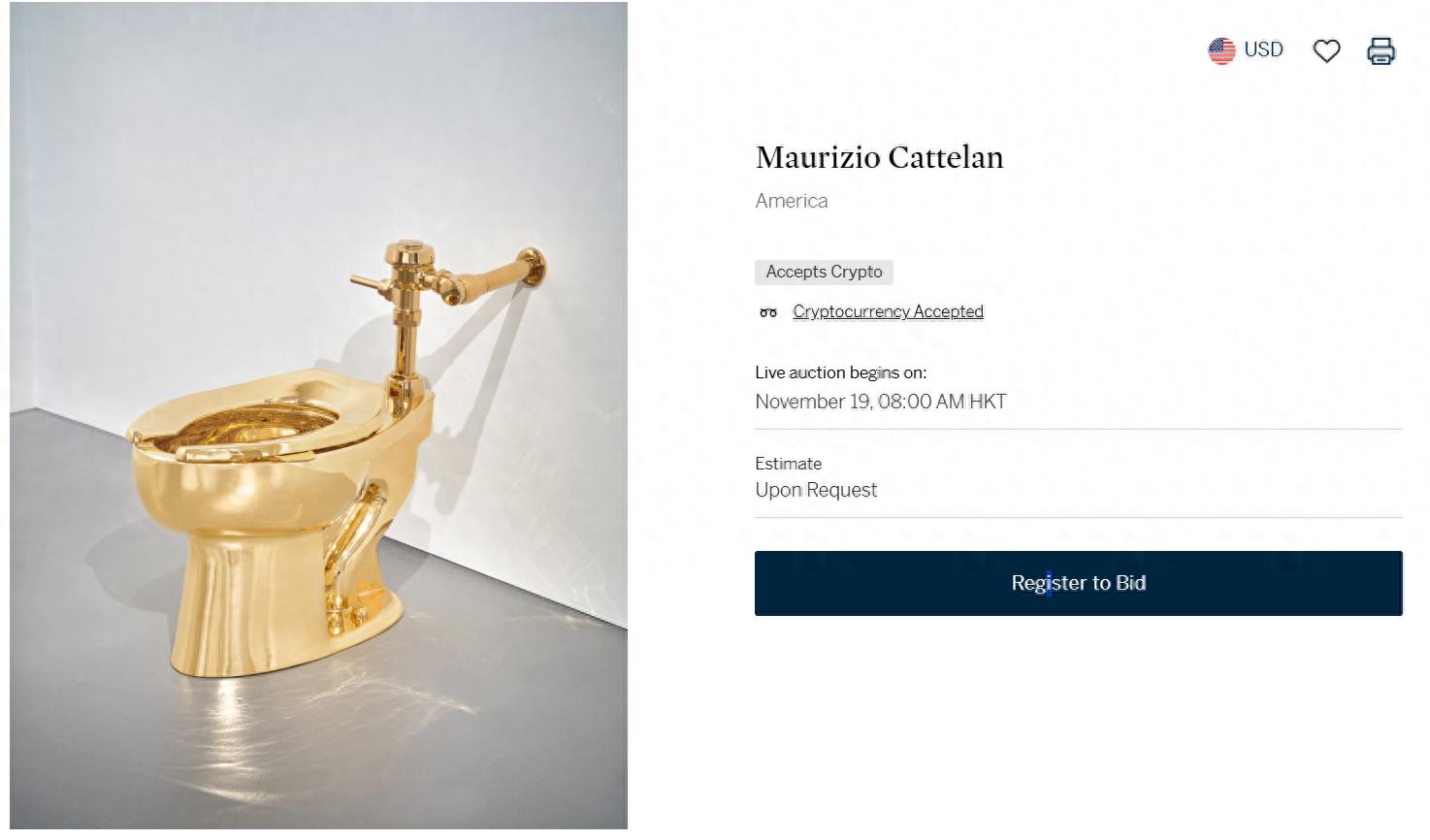 苏富比拍卖行官网显示,将在美国当地时间11月18日晚间(北京时间11月19日早晨)拍卖这件使用101.2千克18K黄金打造的马桶。起拍价将参考黄金现价,目前约为1000万美元。