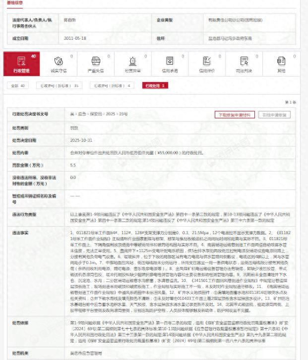 记者于信用中国行政处罚信息栏获悉,10月31日,国家能源集团宁夏煤业有限责任公司金凤煤矿(下称“国能宁夏煤业金凤煤矿”)收到罚单,其处罚类别为“罚款”,处罚机关为吴忠市应急管理局。
