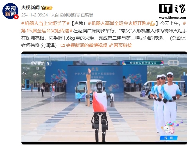 综合此前报道,第十五届全运会的火炬传递过程也有不少科技元素。其中,“夸父”人形机器人作为特殊火炬手在深圳亮相,手握 1.6kg 重量的火炬,完成第二棒与第三棒之间的传递;机器狗将全运会吉祥物交给火炬手。