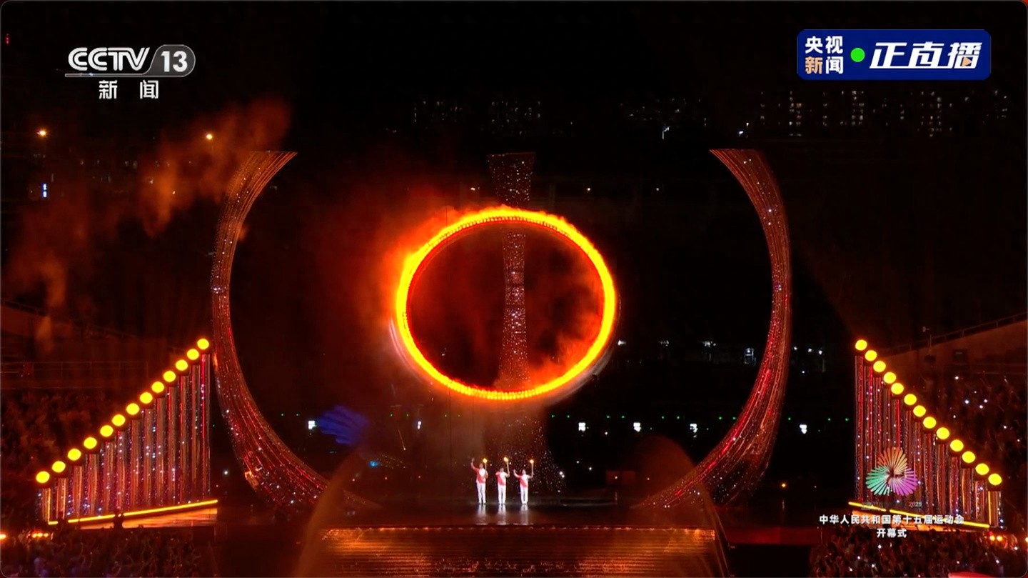 第十五届全国运动会(全运会)于 11 月 9 日晚在广东奥林匹克体育中心体育场开幕,手擎“绽放”火炬的火炬手踏着水舞台的水浪浪花而来,拾级而上“点燃”主火炬塔。