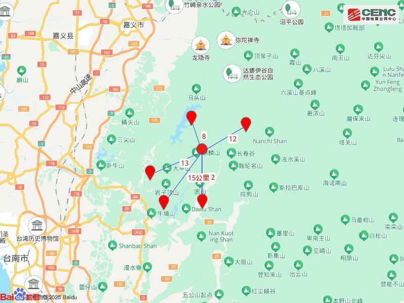 周边县城:震中距大埔乡8公里、距甲仙区12公里、距那玛夏区12公里、距楠西区13公里、距南化区15公里,距台湾嘉义市34公里。