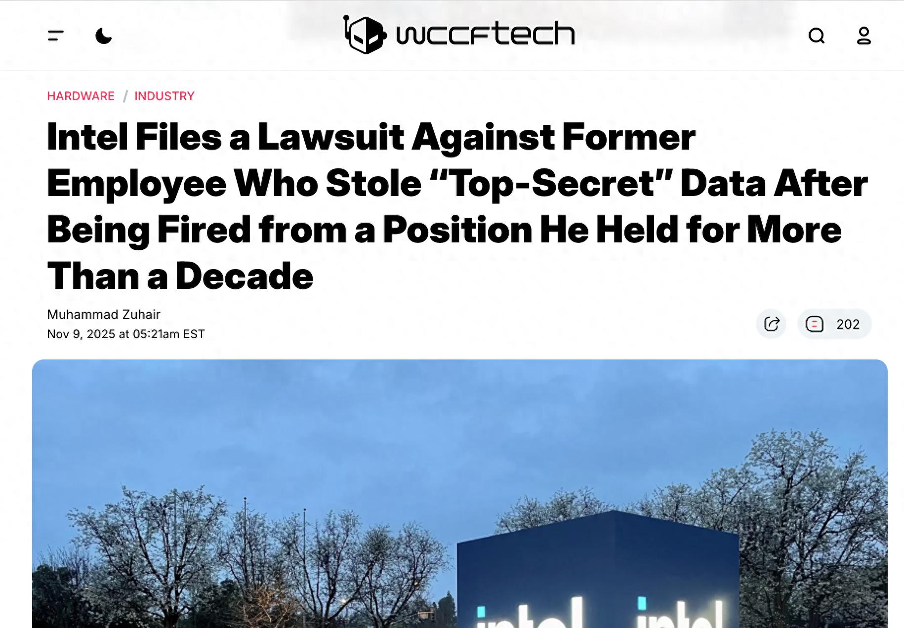 11月10日消息,据wccftech报道,科技巨头英特尔陷入一场员工数据窃取纠纷,其将一名前员工告上华盛顿州联邦法院。