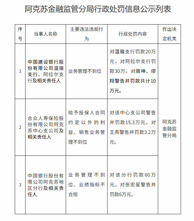 合众人寿保险股份有限公司阿克苏中心支公司因给予投保人合同约定以外的利益、销售业务管理不到位,被警告并罚款15.3万元,相关责任人王燕被警告并罚款3.2万元;