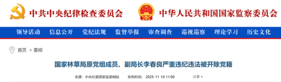 中央纪委国家监委网站11月10日消息,经中共中央批准,中央纪委国家监委对国家林业和草原局(国家公园管理局)原党组成员、副局长李春良严重违纪违法问题进行了立案审查调查。