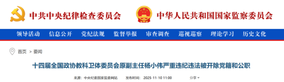 中央纪委国家监委网站11月10日消息,经中共中央批准,中央纪委国家监委对十四届全国政协教科卫体委员会原副主任杨小伟严重违纪违法问题进行了立案审查调查。