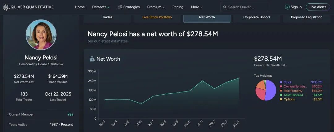 据Quiver Quantitative显示,佩洛西和她的丈夫在佩洛西于国会任职的38年间,通过股票交易获利超过1.3亿美元——回报率高达16930%。相比之下,道琼斯指数同期的涨幅为2300%。佩洛西一家如今的资产约2.8亿美元,而她刚进入国会时,家庭资产约为300万美元。