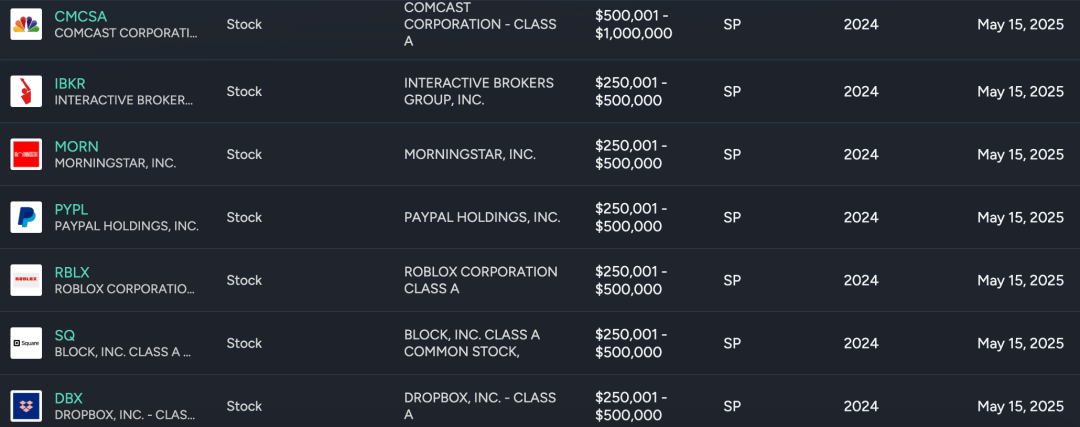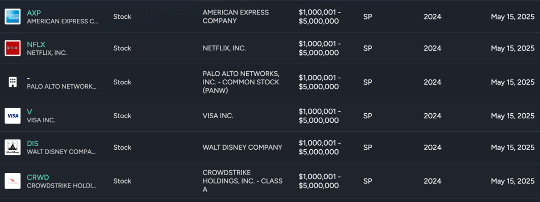 佩洛西2024年的财务披露报告显示,她当时持有约24只个股,包括英伟达、Salesforce、奈飞、苹果等公司,其中苹果是她最大的持仓股票,价值在2500万至5000万美元。
