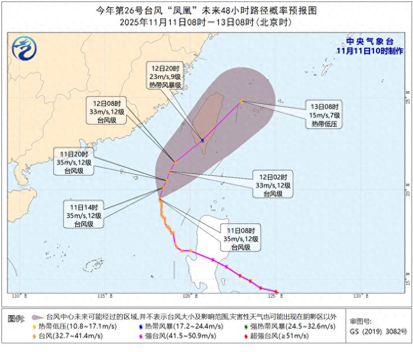 预计,“凤凰”将以每小时10公里左右的速度向北偏东方向移动,11日白天强度维持,11日夜间开始逐渐转向东北方向移动,强度逐渐减弱,并将于12日下午到夜间在台湾岛西南部沿海再次登陆(强热带风暴级,10-11级,25-30米/秒),之后快速减弱。