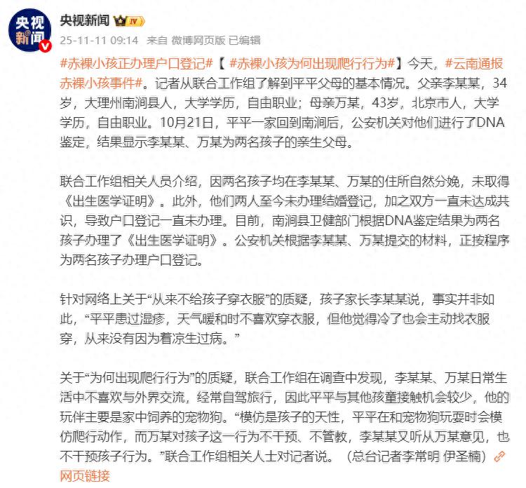今天,云南通报“赤裸小孩”事件。记者从联合工作组了解到平平父母的基本情况。父亲李某某,34岁,大理州南涧县人,大学学历,自由职业;母亲万某,43岁,北京市人,大学学历,自由职业。10月21日,平平一家回到南涧后,公安机关对他们进行了DNA鉴定,结果显示李某某、万某为两名孩子的亲生父母。