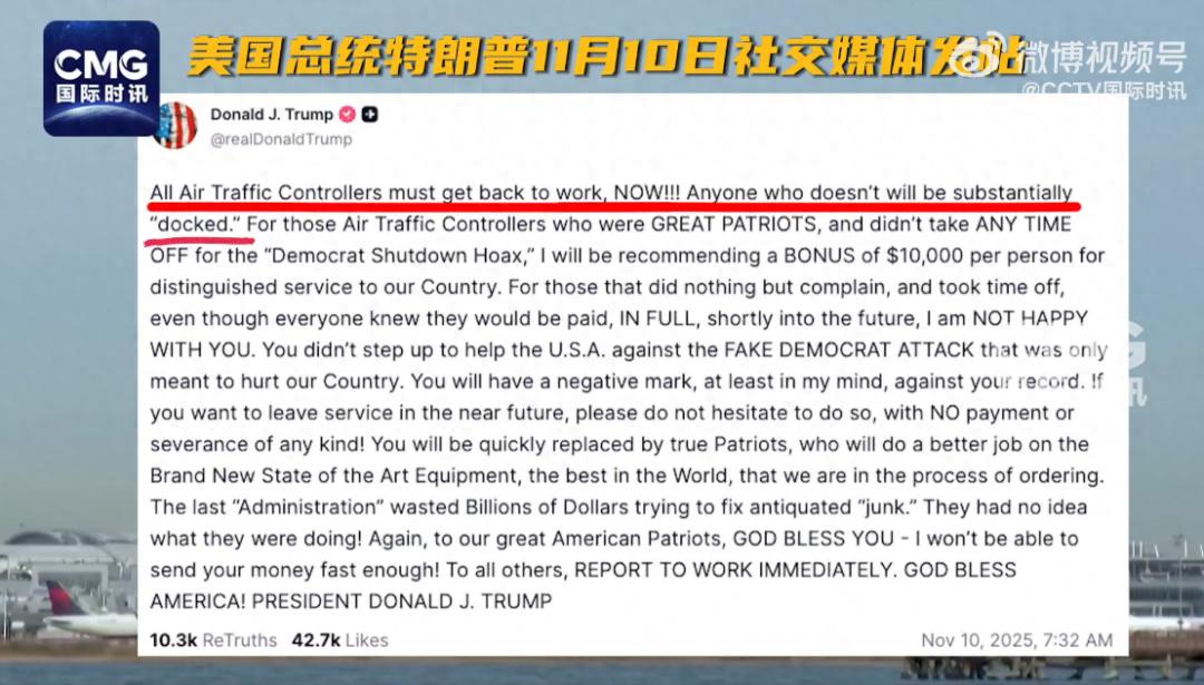 11月11日,据CCTV国际时讯消息,当地时间11月10日,美国总统特朗普在其社交平台上发文:“所有空中交通管制员必须立即返岗,任何不返岗者都将被大幅‘扣薪’。”而对于那些在政府“停摆”期间没有请假的空管员,特朗普建议每人发1万美元的奖金。