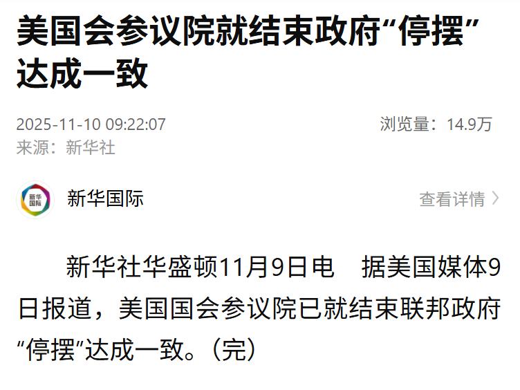 据美国媒体9日报道,美国国会参议院已就结束联邦政府“停摆”达成一致。