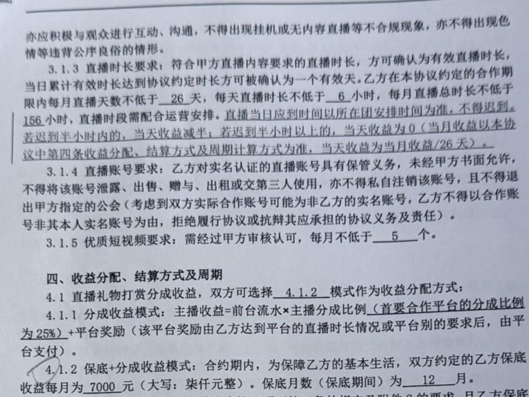 18岁的李芝在暑假通过招聘软件找到一份团播兼职。面试时,公司称底薪7000元,有化妆师、服装,只要练舞跳舞就行。“他们说很轻松,还保证有保底工资”,李芝回忆,她当天就被要求签下一份合作协议。但开播后,运营要求她穿“开放一些”“能吸引男生”的衣服,她没有同意。二十多天后,公司称团播绩效太差,宣布解散,并以“开播有效时长不足”为由将她清退,未付工资。随后,她辗转拿到了自己签署的合同,抬头为“合作协议”,这份协议规定账号、肖像、短视频内容均归公司所有,违约行为需支付高额赔偿,附件条款还注明“平台分成比例仅供参考,不构成最终结算依据”。