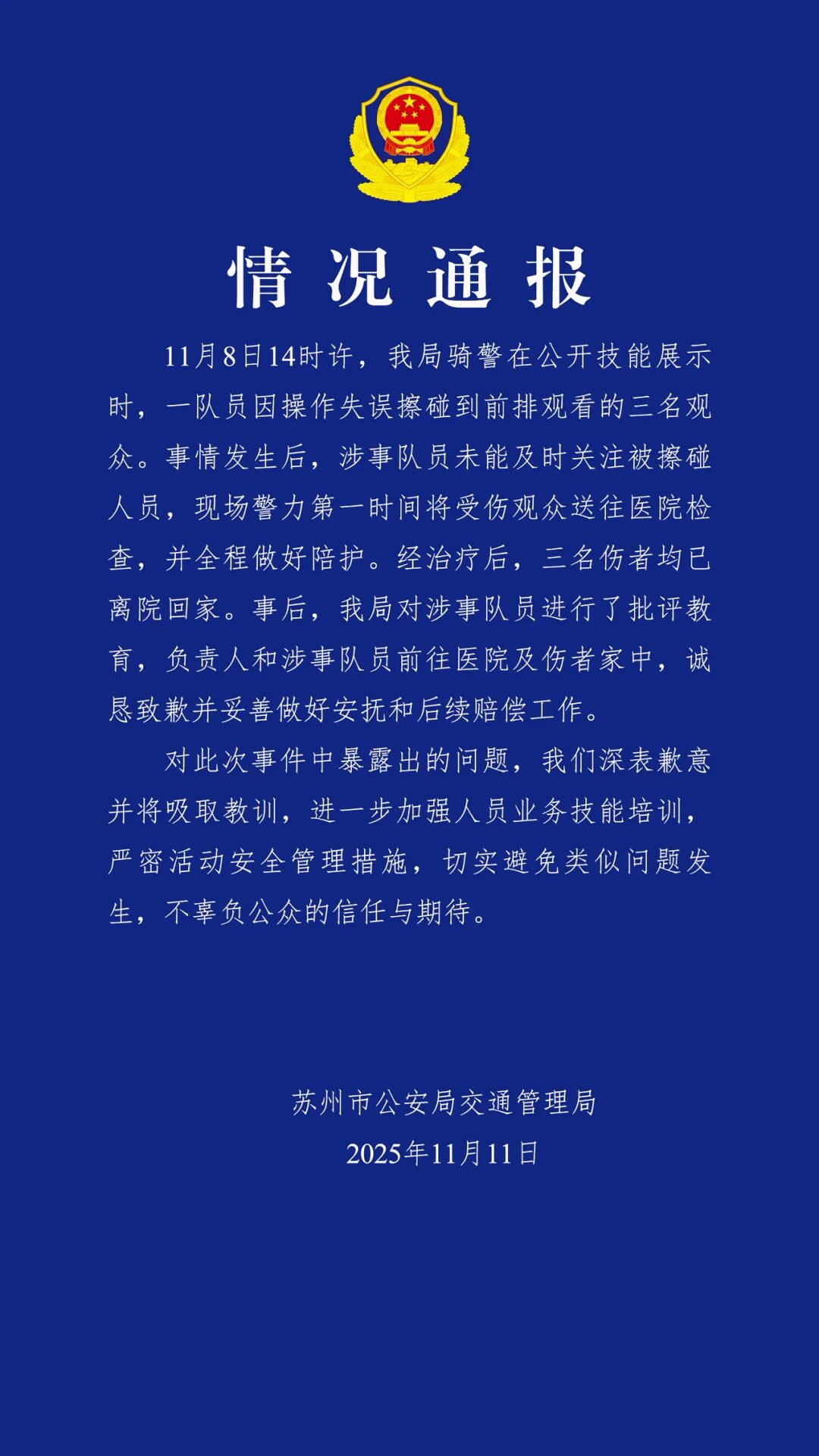 苏州市公安局交通管理局11月11日发布情况通报:11月8日14时许,我局骑警在公开技能展示时,一队员因操作失误擦碰到前排观看的三名观众。事情发生后,涉事队员未能及时关注被擦碰人员,现场警力第一时间将受伤观众送往医院检查,并全程做好陪护。经治疗后,三名伤者均已离院回家。事后,我局对涉事队员进行了批评教育,负责人和涉事队员前往医院及伤者家中,诚恳致歉并妥善做好安抚和后续赔偿工作。