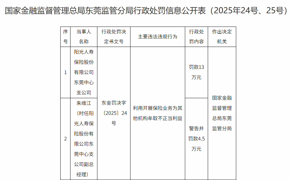 11月11日,国家金融监督管理总局东莞监管分局披露最新行政处罚信息,阳光人寿保险股份有限公司东莞中心支公司因存在利用保险业务为其他机构牟取不正当利益的违规行为,被处以13万元罚款。与此同时,时任该中支副总经理的朱维江也因相关责任,受到警告并罚款4.5万元。这已是阳光人寿及其下属企业近一个月内收到的又一张罚单。