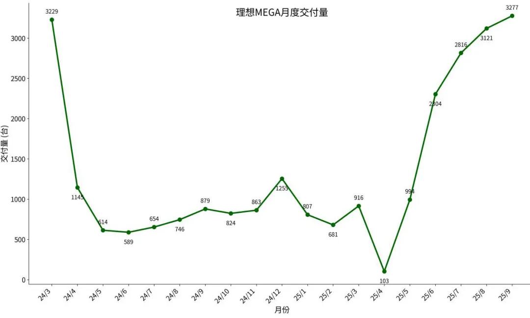 MEGA可谓命运多舛,发布之初高开低走,一度跌到月销不足600辆的窘境,其后,慢慢反弹。今年6-9月,其每月均稳定交付2300辆以上。