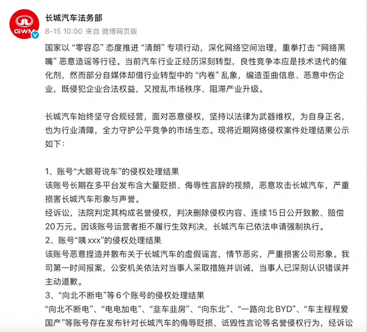 界面新闻注意到,今年8月15日,长城汽车公布的网络侵权案件处理结果显示,账号“大眼哥说车”长期在多平台发布含大量贬损、侮辱性言辞的视频,恶意攻击长城汽车,严重损害长城汽车形象与声誉。经诉讼,法院判定其构成名誉侵权,判决删除侵权内容、连续15日公开致歉、赔偿20万元。因该账号运营者拒不履行生效判决,长城汽车已依法申请强制执行。