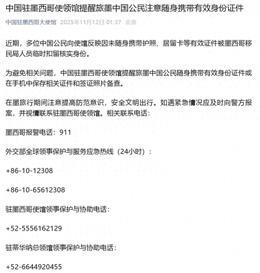 11月12日,中国驻墨西哥大使馆发文:近期,多位中国公民向使馆反映因未随身携带护照、居留卡等有效证件被墨西哥移民局人员临时扣留核实身份。