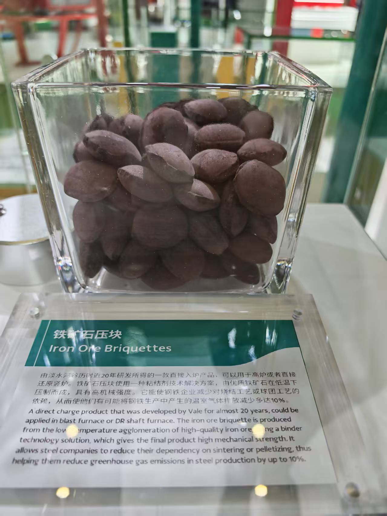 展台上陈列着形如话梅核的铁矿石压块,是淡水河谷历时近20年研发而成的直接入炉产品。它采用专属粘结剂技术,以优质矿粉在低温下压制成型,机械强度高,或能帮助钢铁企业将炼钢过程中的温室气体排放降低至多10%,成为绿色转型中的一大亮点。