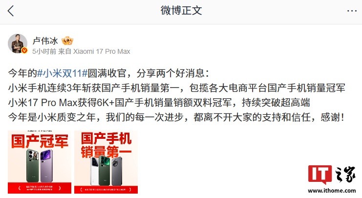 据IT之家此前报道,在 10 月 23 日的小米 REDMI K90 系列手机发布会上,小米集团合伙人、总裁、手机部总裁、小米品牌总经理卢伟冰宣布,小米 17 系列手机大获成功。小米 17 系列的总销量比上一代增长 30%,其中 Pro 版本占比超 80%。