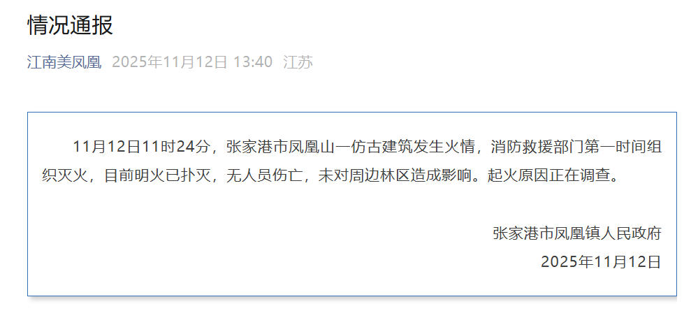 据“江南美凤凰”微信公众号消息,11月12日11时24分,张家港市凤凰山一仿古建筑发生火情,消防救援部门第一时间组织灭火,目前明火已扑灭,无人员伤亡,未对周边林区造成影响。起火原因正在调查。