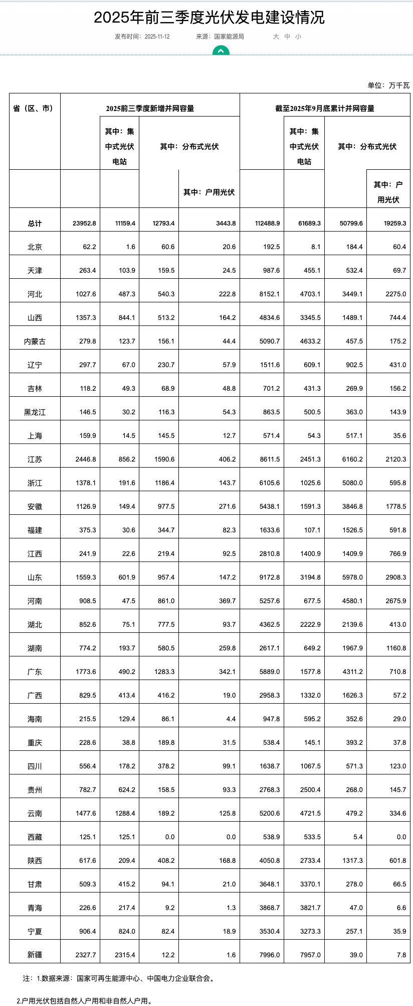 国家能源局公布前三季度光伏发电建设情况:2025前三季度新增并网容量23952.8万千瓦,其中集中式光伏电站11159.4万千瓦,分布式光伏12793.4万千瓦。