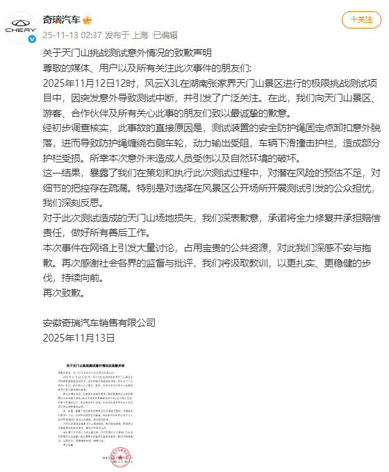 奇瑞汽车发布关于天门山挑战测试意外情况的致歉声明,全文如下↓