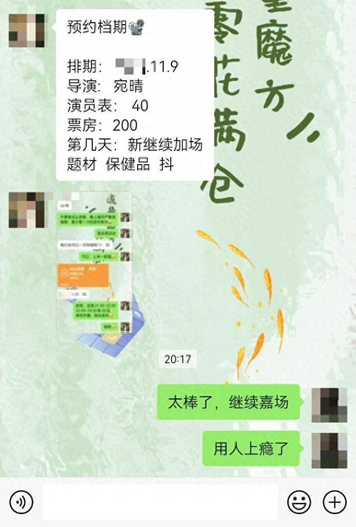 记者在多个社交平台搜索发现,有不少关于“直播间数据‘加热’”的宣传广告。一名博主发文称,可“手动刷推荐、配合带节奏”。由此还产生了行业“黑话”:用户购买服务被称为“买菜”,售卖直播数据的人称为“导演”,参与互动的真人称为“演员”,购买的总数称为“票房”。
