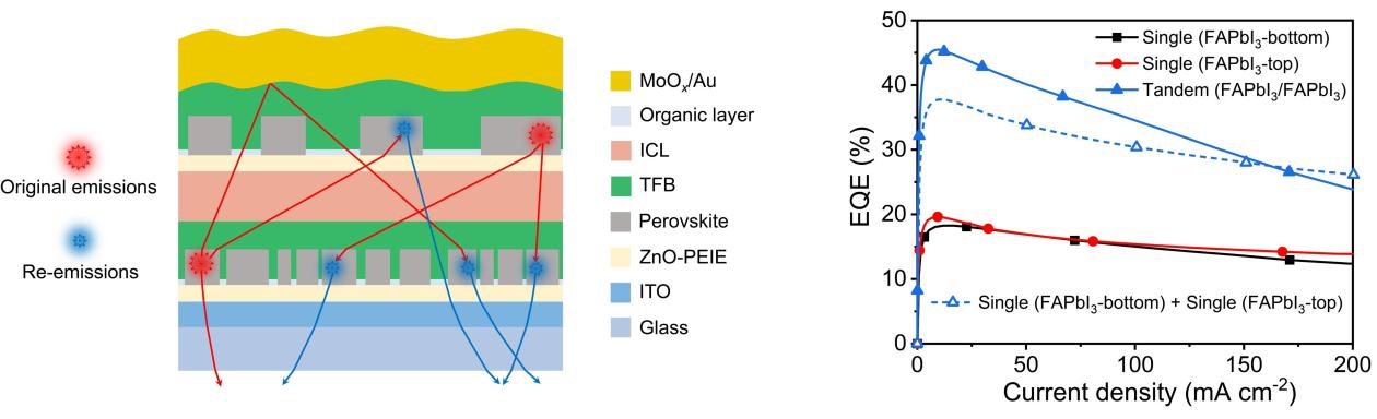 此次研究中,团队通过优化连接层结构,实现了叠层器件中高效的电荷注入与平衡。论文共同通讯作者、柔性电子全国重点实验室教授王建浦介绍:“更为重要的是,我们通过调控钙钛矿发光层的微纳结构,创新性地提出利用叠层器件中独特的层间光子循环效应的策略,即一个发光单元产生的光子可被另一钙钛矿层重新吸收并再次发射,从而突破了传统光提取效率的限制,实现了‘1+1>2’的效果。”