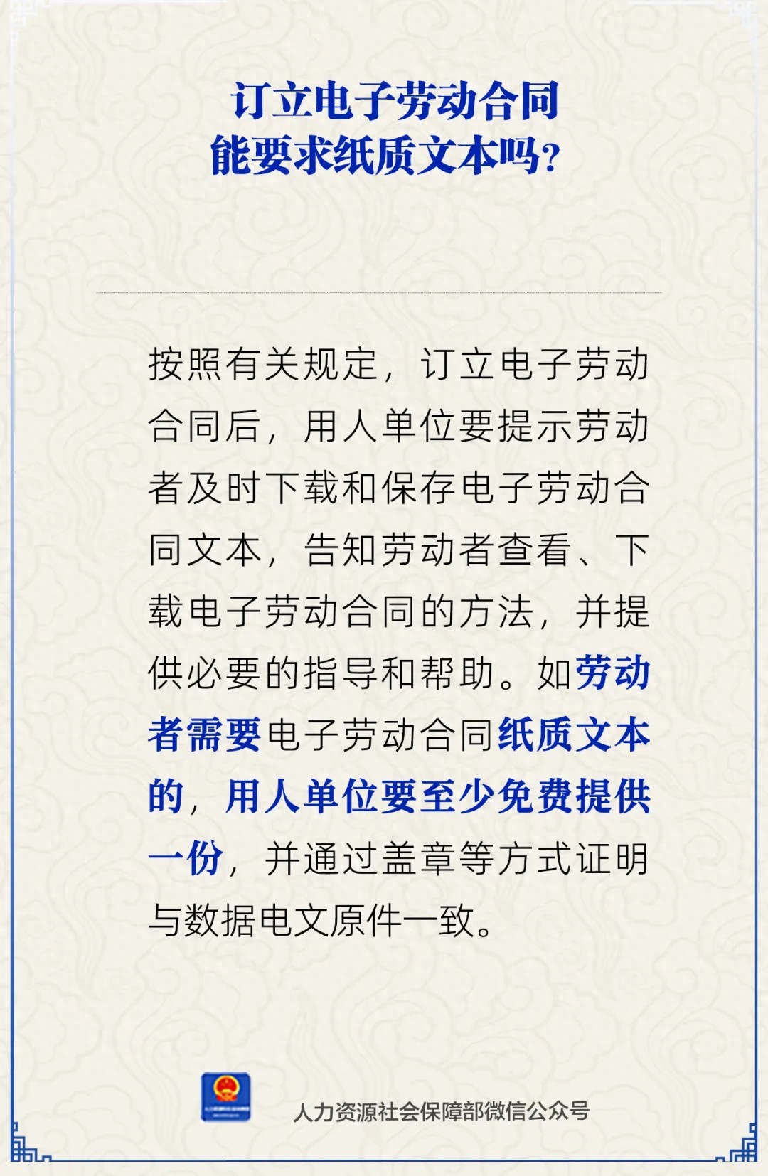 订立电子劳动合同能要求纸质文本吗?人社部11月14日通过官方微信公众号作出解答。